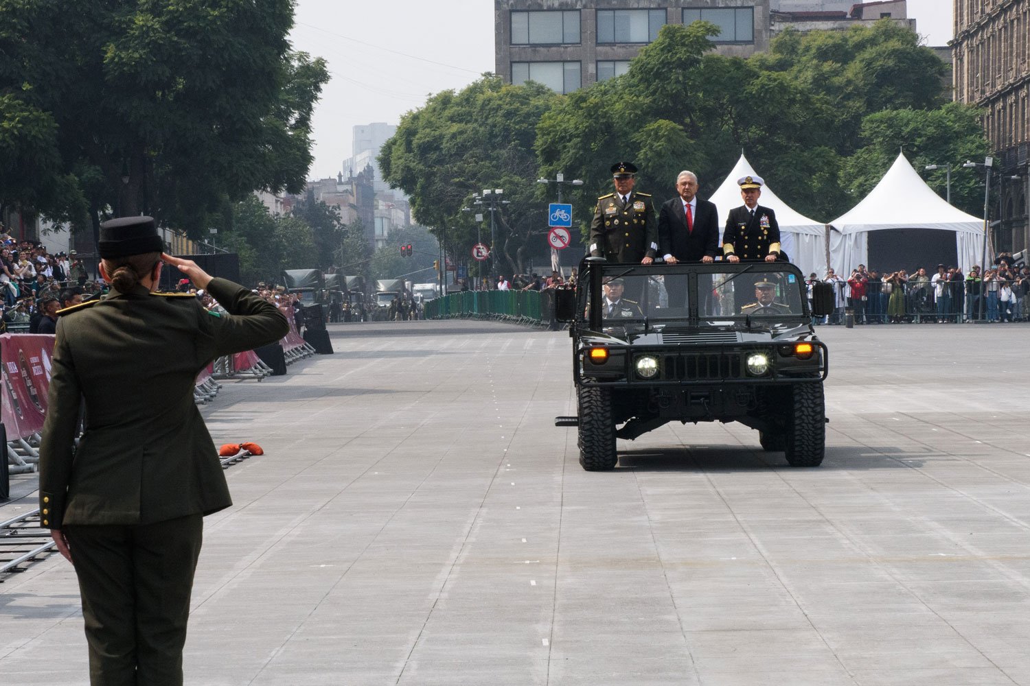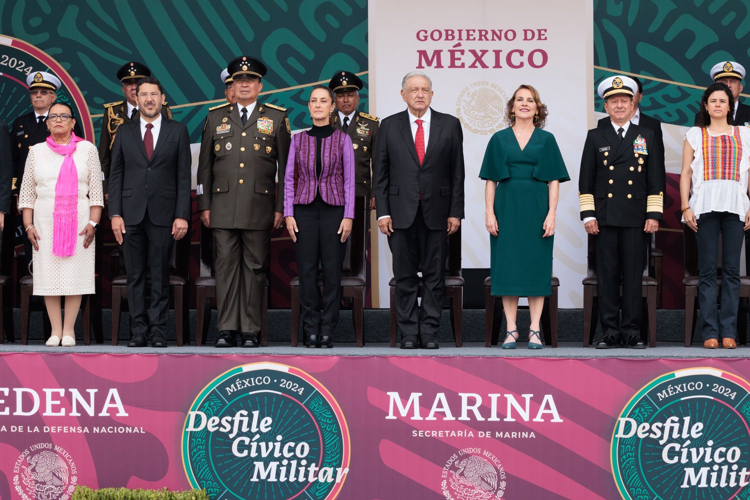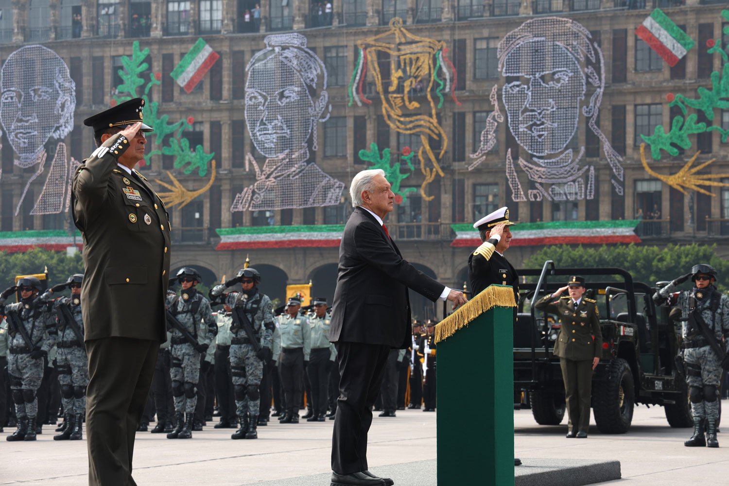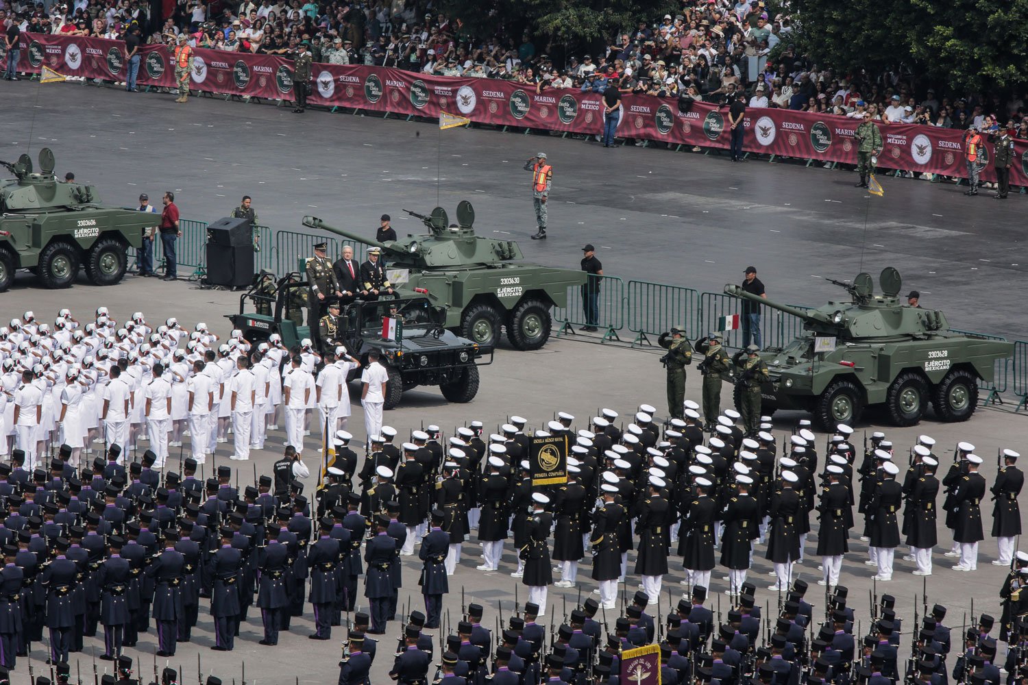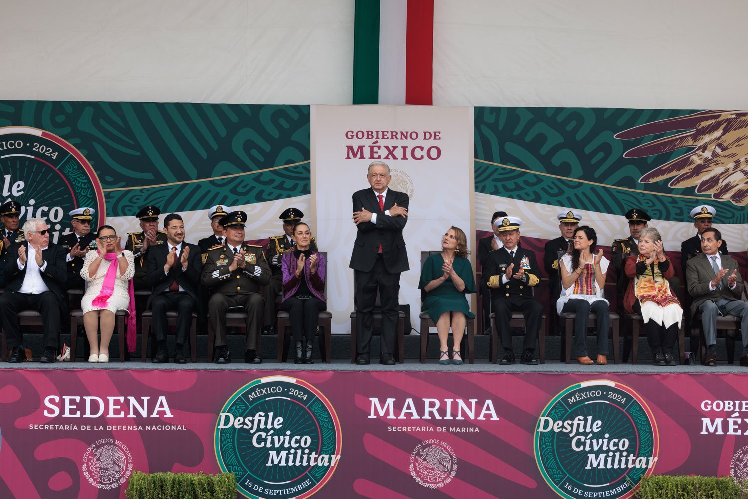 El acto comenzó puntualmente a las 10:00 horas con el traslado del presidente desde Palacio Nacional al dispositivo de honor. Acompañado por Beatriz Gutiérrez Müller, la presidenta electa Claudia Sheinbaum y los secretarios de la Defensa Nacional, Luis Cresencio Sandoval, y de Marina, Rafael Ojeda Durán, López Obrador pasó revista a las tropas a bordo de su vehículo Humvee presidencial. La estela tricolor que dejaron los aviones de la Fuerza Aérea Mexicana llenó de emoción a los presentes, mientras el lábaro patrio ondeaba con orgullo.