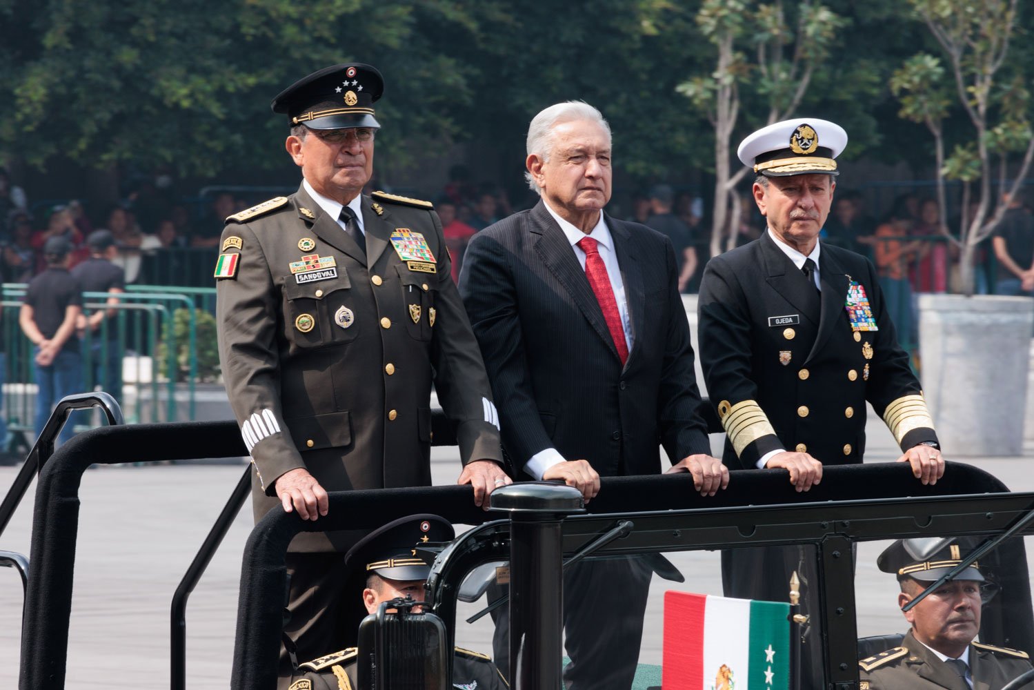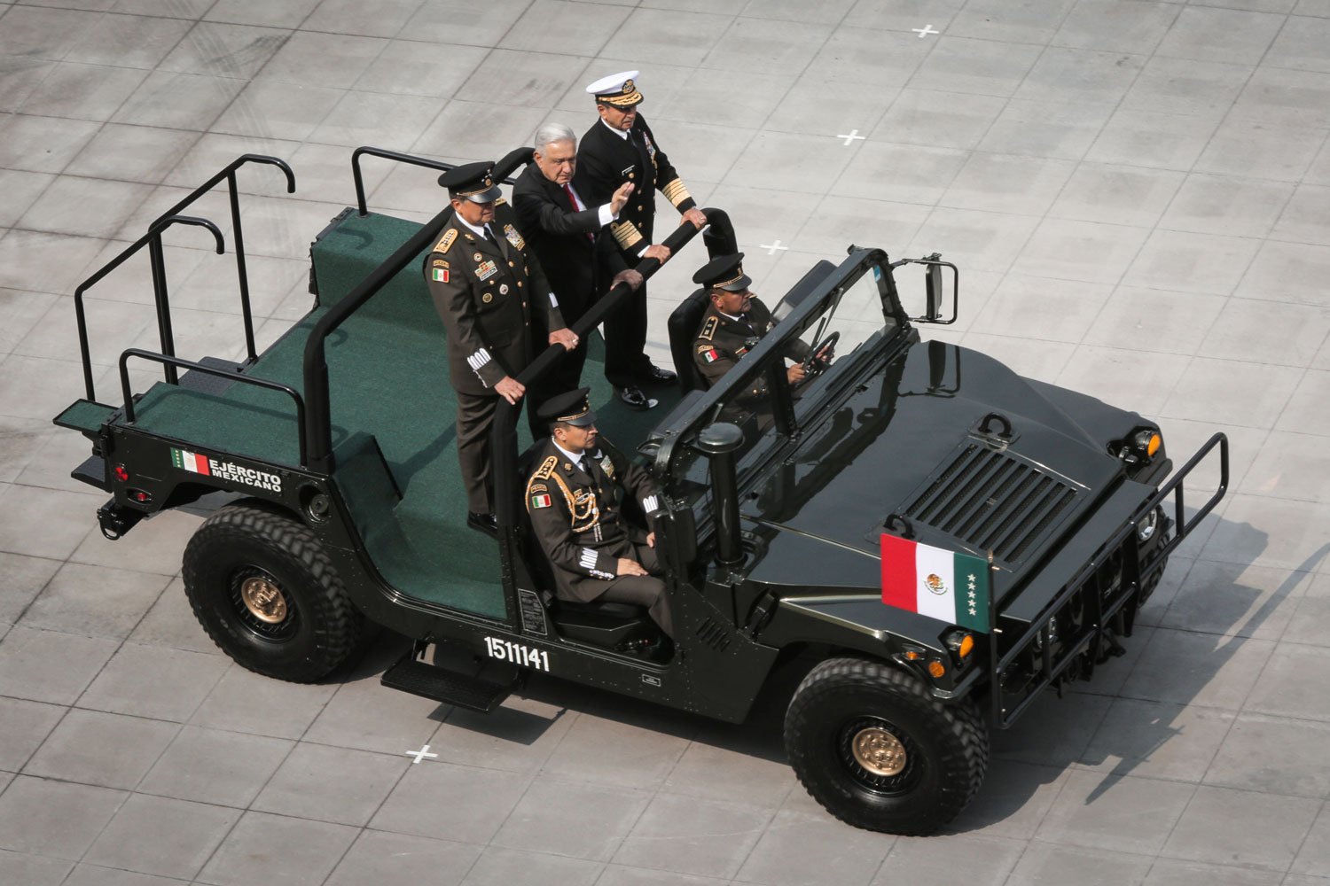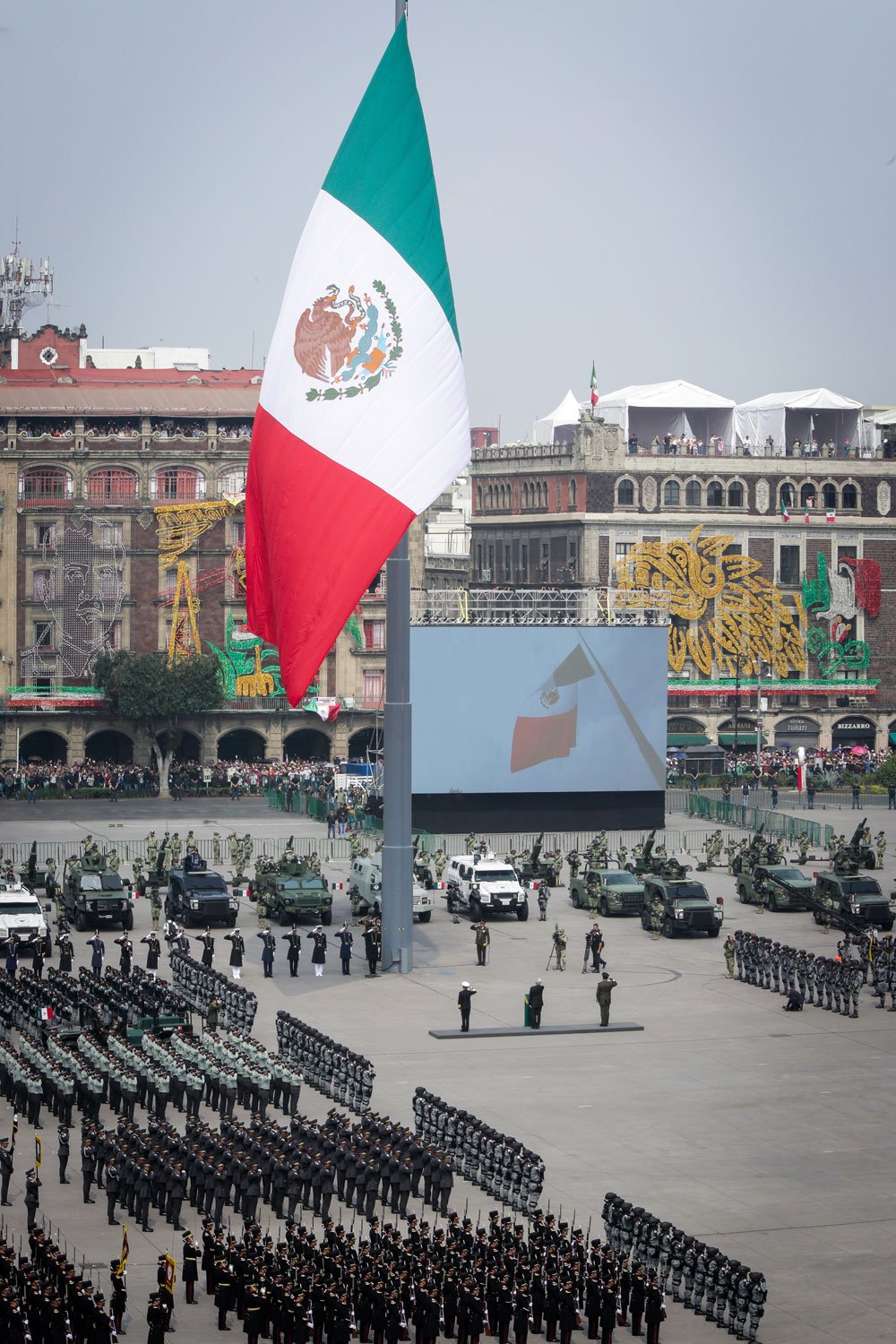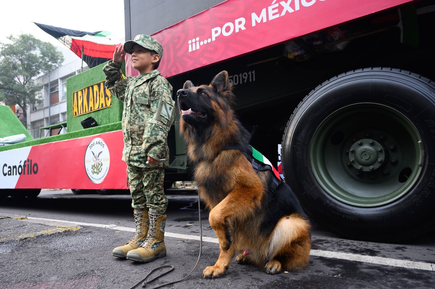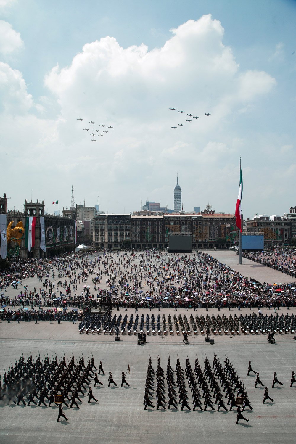 El acto comenzó puntualmente a las 10:00 horas con el traslado del presidente desde Palacio Nacional al dispositivo de honor. Acompañado por Beatriz Gutiérrez Müller, la presidenta electa Claudia Sheinbaum y los secretarios de la Defensa Nacional, Luis Cresencio Sandoval, y de Marina, Rafael Ojeda Durán, López Obrador pasó revista a las tropas a bordo de su vehículo Humvee presidencial. La estela tricolor que dejaron los aviones de la Fuerza Aérea Mexicana llenó de emoción a los presentes, mientras el lábaro patrio ondeaba con orgullo.