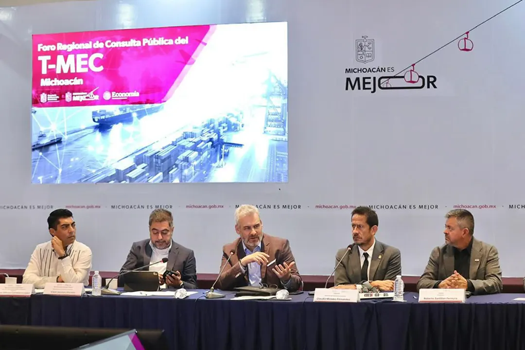 Morelia, Michoacán, 17 de octubre de 2025.- En Michoacán, el gobernador Alfredo Ramírez Bedolla puso en marcha el Foro Regional de Consulta Pública del T-MEC, donde integrantes del sector empresarial y productivo del estado aportan propuestas que contribuyan a construir un mejor tratado comercial con Estados Unidos y Canadá.
