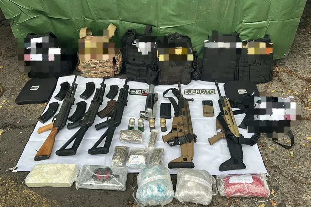 De acuerdo con el informe oficial, en el sitio se decomisaron cinco fusiles, cuatro granadas, un aditamento lanzagranadas, 525 cartuchos útiles y varios cargadores, además de seis chalecos balísticos con siglas alusivas a una organización criminal. También se encontraron un paquete con aproximadamente un kilogramo de cocaína y tres bolsas con un kilo de marihuana.