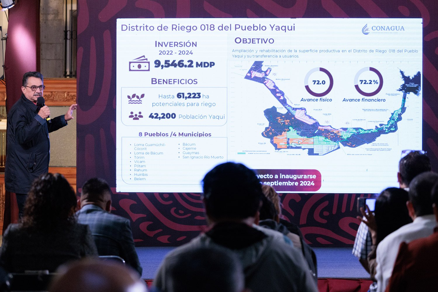 El distrito de riego 018, con una inversión de 9 mil 546.2 millones de pesos, será inaugurado el 27 de septiembre. La obra incluye la ampliación del canal principal a 52.83 kilómetros, la rehabilitación de la presa derivadora El Chiculi y la construcción de un sifón para cruzar el río Yaqui. Desde diciembre de 2023, la Comisión Jiaki del Agua, conformada por miembros de la comunidad yaqui, se encarga de la operación y conservación de esta infraestructura. La comunidad yaqui logró producir con éxito su primer ciclo agrícola otoño-invierno bajo este nuevo sistema.