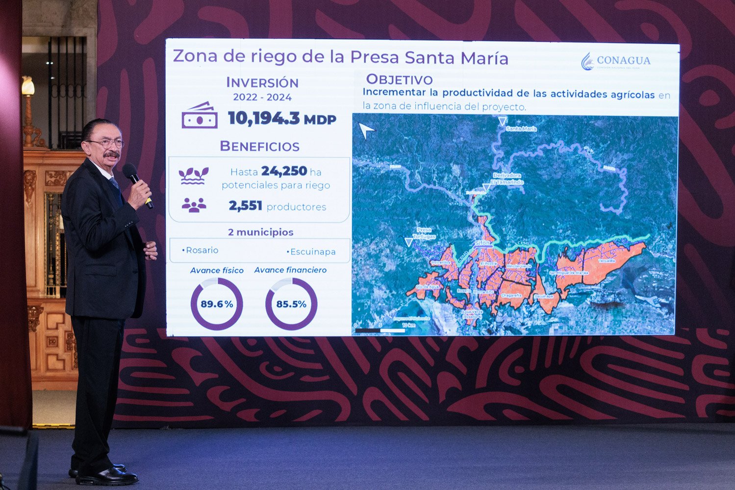La culminación del proyecto de la presa Santa María permitirá el riego de 24 mil 250 hectáreas, beneficiando a 2 mil 551 productores en los municipios de Rosario y Escuinapa. La obra se destaca por su capacidad para transformar significativamente la producción agrícola en la región, aumentando la producción anual de jitomate de 25 mil a 173 mil toneladas, de mango de 58 mil a 164 mil toneladas y de chile de 98 mil a 327 mil toneladas.