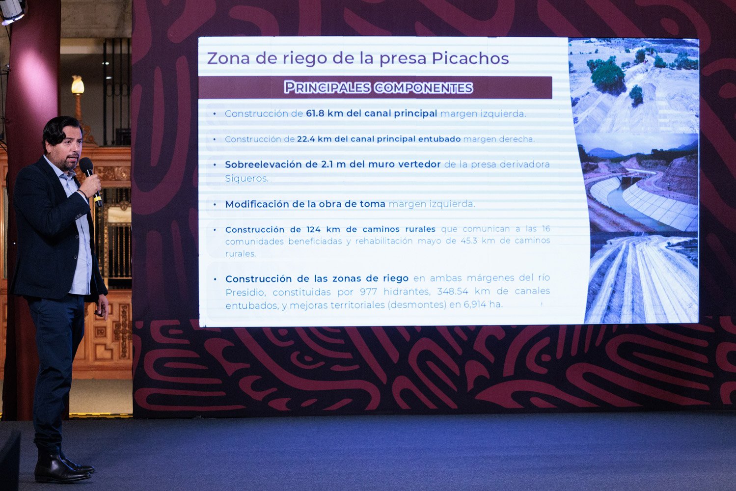 En conferencia de prensa matutina con el presidente Andrés Manuel López Obrador, los responsables de los proyectos hídricos prioritarios expusieron las características de los distritos de riego 018 del pueblo yaqui, en Sonora; 111 de la presa Picachos y 114 de la presa Santa María, ambas en Sinaloa y 043 ‘Alejandro Gascón Mercado’, en Nayarit.
