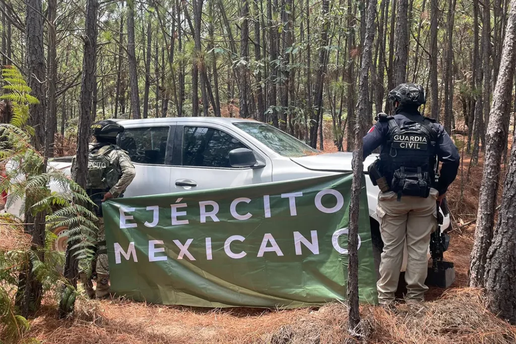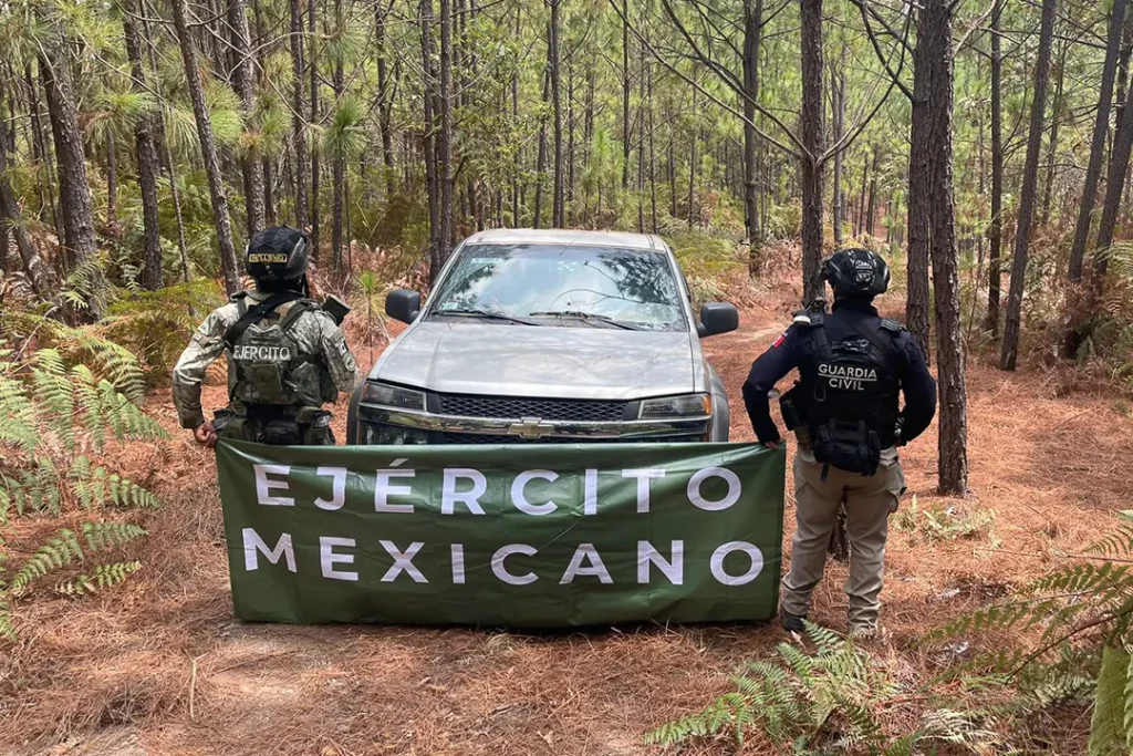 En seguimiento a las labores de vigilancia y disuasión del delito en la localidad de El Olivo, los agentes de la Guardia Civil y el Ejército Mexicano localizaron en una zona de abundante vegetación cuatro unidades de las marcas Chevrolet, Toyota, Jeep y Nissan en aparente estado de abandono, las cuales cuentan con una leyenda alusiva a una célula delictiva.