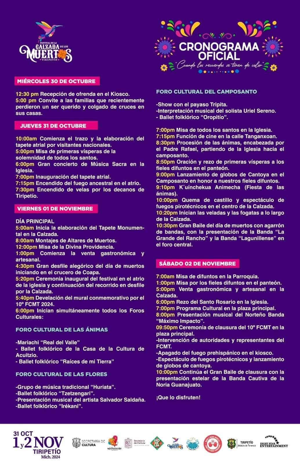 En entrevista con este medio Pineda Chávez señalo que este año, el festival contará con una variada oferta cultural, religiosa, gastronómica y artesanal, que promete deleitar a los asistentes con la esencia pura de la festividad. Durante el 1 y 2 de noviembre, Tiripetío se vestirá de gala con altares, tapetes tradicionales y, por supuesto, dos grandes bailes gratuitos que encenderán el corazón de la comunidad y visitantes.