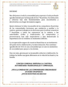 El Consejo Comunal Indígena de La Cantera agradeció profundamente el esfuerzo conjunto, señalando que la recuperación de los policías es un testimonio del poder de la unidad y la determinación en momentos difíciles.