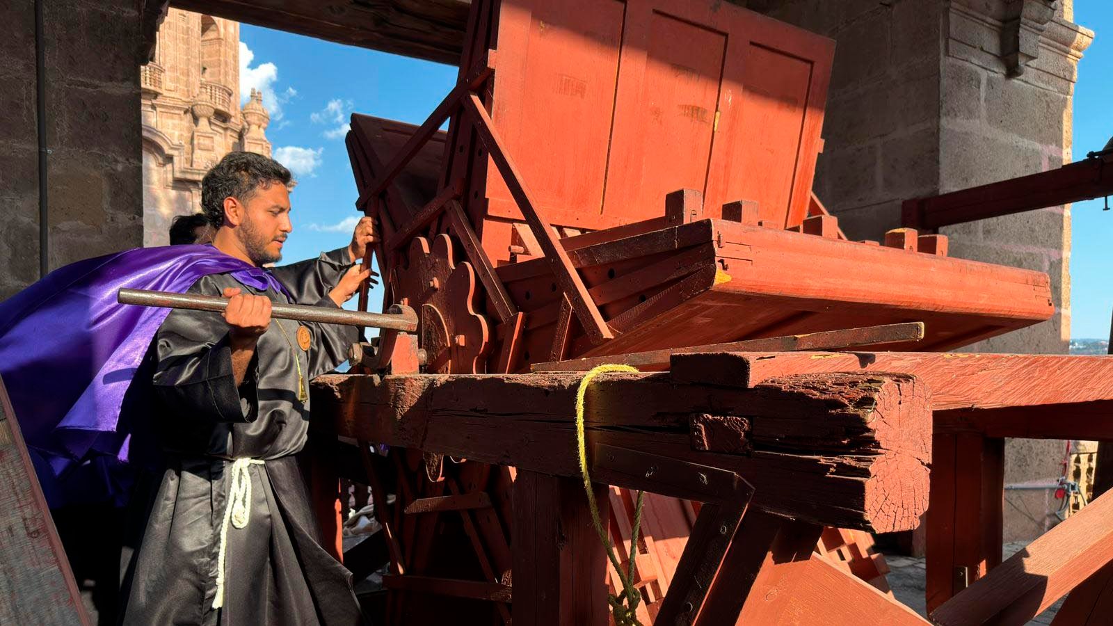 Morelia, Michoacán, 3 de abril de 2026.- La matraca monumental de Morelia, única en funcionamiento en México, acompañará este viernes la edición 50 de la Procesión del Silencio, una de las celebraciones más representativas de la Semana Santa en el país.