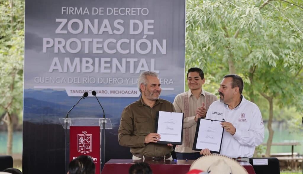 Lago de Camécuaro, Zamora, Michoacán, 17 de septiembre de 2024.– En un importante paso hacia la conservación y el desarrollo sostenible, el gobernador Alfredo Ramírez Bedolla firmó los decretos que designan a la Cuenca del Río Duero y el predio La Añilera, en Tumbiscatío, como Zonas de Protección Ambiental.