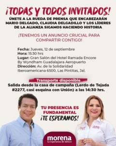 Mario Delgado y Claudia Delgadillo han convocado a rueda de prensa este jueves 12 de septiembre a las 15:30 horas en Guadalajara, Jalisco, donde se anuncia que habrá un anuncio muy importante.