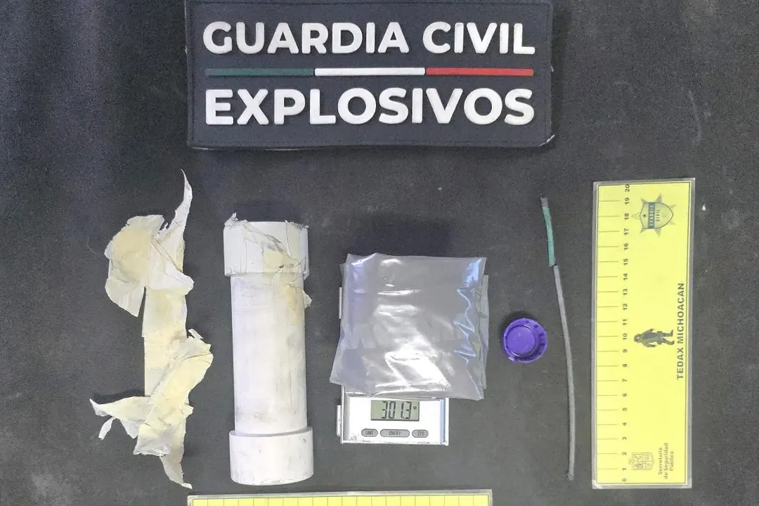 Durante una marcha de normalistas en Morelia, la SSP, mediante la Guardia Civil y AROP, aseguró y desactivó dos artefactos tipo granada hechos con tubos de PVC (301 g de pólvora cada uno) y mecha de 20 cm, evitando daños.