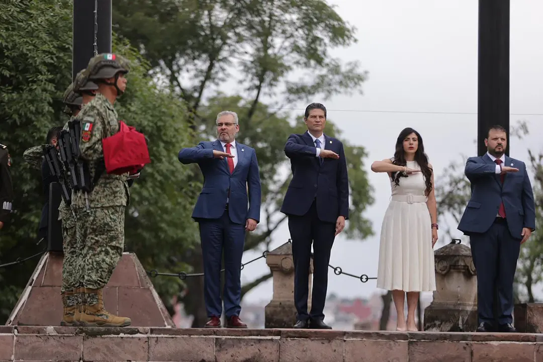 El gobernador Alfredo Ramírez Bedolla encabezó el acto conmemorativo por el 260 aniversario del natalicio de José María Morelos en Morelia, con presencia de autoridades estatales.