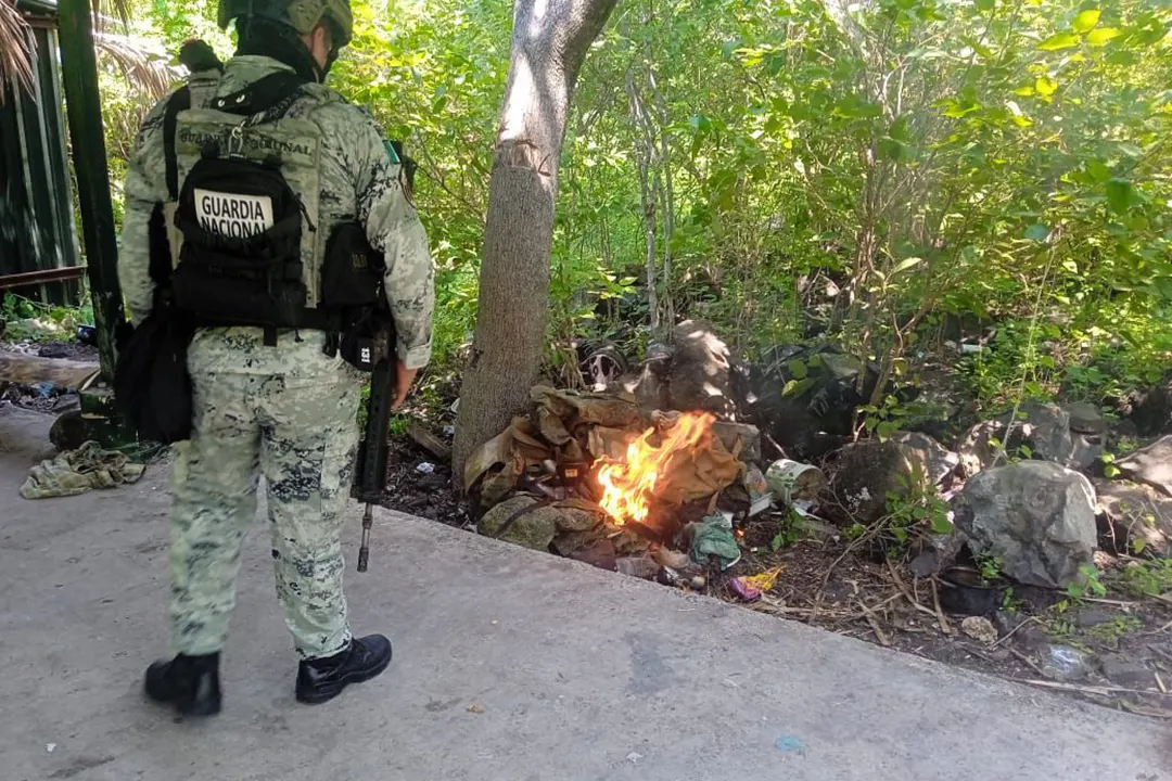 En un operativo en Buenavista, SSP y Sedena destruyeron un campamento criminal, hallando uniformes con insignias y equipo táctico en la región de Tierra Caliente.
