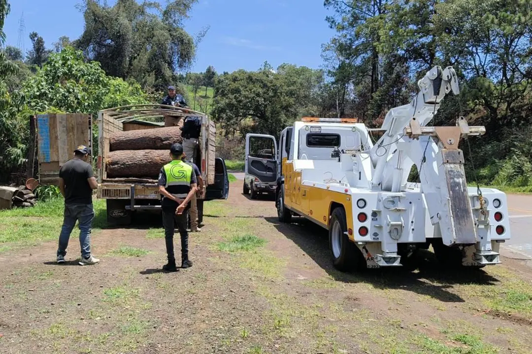 SSP Michoacán y Policía Municipal aseguraron un predio con más de 34 mil m³ afectados por tala ilegal en Uruapan y decomisaron vehículos vinculados al delito ambiental.