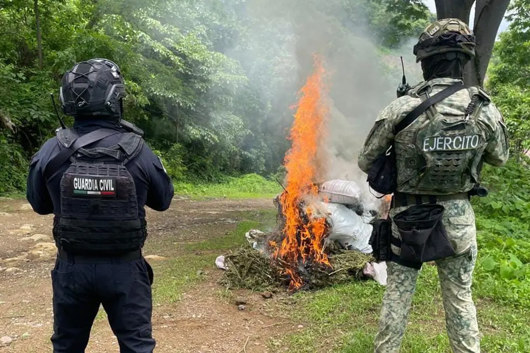 Autoridades localizaron e incineraron 16 costales de marihuana en Tuzantla, Michoacán, como parte de acciones contra delitos contra la salud.
