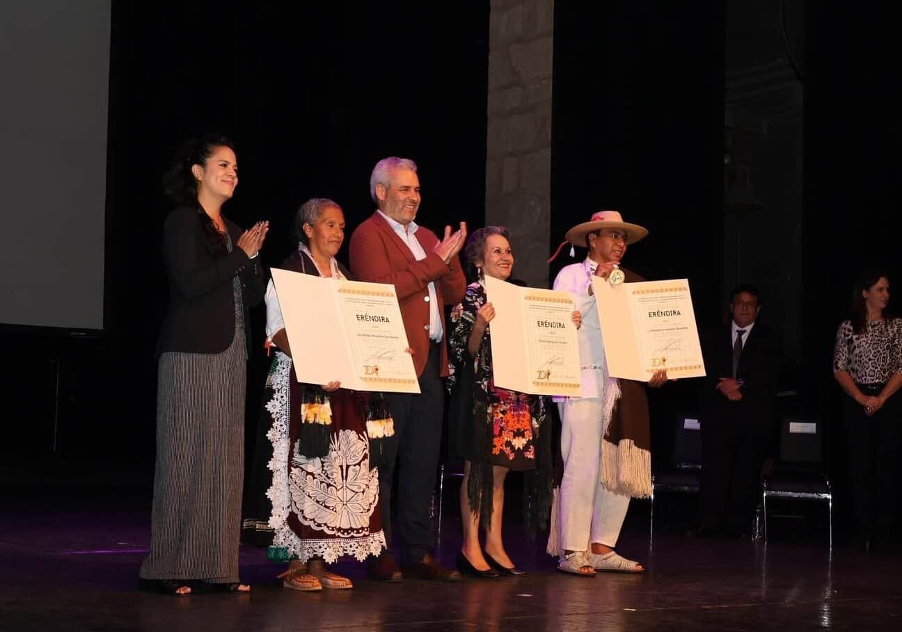 Morelia, Michoacán, 10 de octubre de 2024.- En el Teatro Melchor Ocampo se llevó a cabo la ceremonia de entrega del 𝐏𝐫𝐞𝐦𝐢𝐨 𝐄𝐬𝐭𝐚𝐭𝐚𝐥 𝐝𝐞 𝐥𝐚𝐬 𝐀𝐫𝐭𝐞𝐬 𝐄𝐫é𝐧𝐝𝐢𝐫𝐚 𝟐𝟎𝟐𝟒 por parte de la Secretaría de cultura del gobierno del estado. En el evento que contó con la presencia del Gobernador Alfredo Ramírez y la Secretaría de Culturta Tamara Sosa, el Gobierno de Michoacán entrego un galardón a quienes enaltecen la cultura