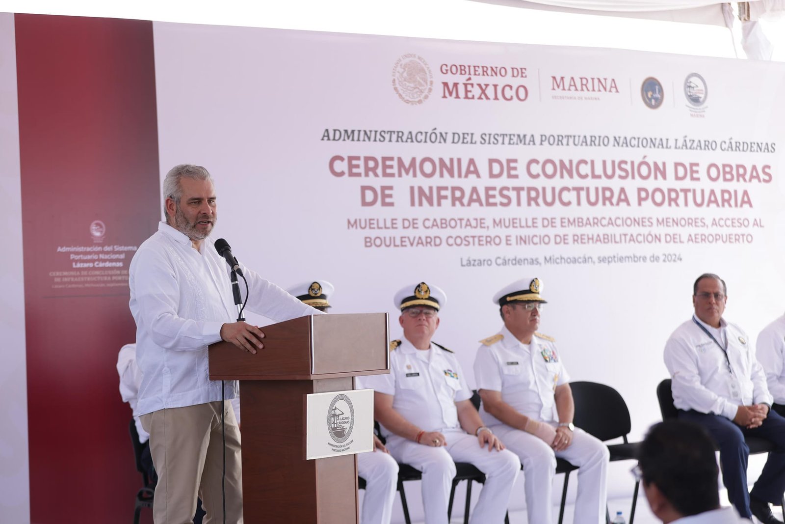 Lázaro Cárdenas, Michoacán, 18 de septiembre de 2024.- El Gobernador Alfredo Ramírez Bedolla encabezó la ceremonia de conclusión de importantes obras de infraestructura portuaria llevadas a cabo por la Administración Portuaria Integral de Lázaro Cárdenas (ASIPONA). El evento, celebrado hoy, también contó con la participación del Coordinador General Cap. Alt. Manuel Fernando Gutiérrez Gallardo, el Vicealmirante Anselmo Osorio Fraga, Director General de ASIPONA Lázaro Cárdenas, y el Director General del Grupo Aeroportuario de la Ciudad de México, entre otras autoridades civiles y militares.