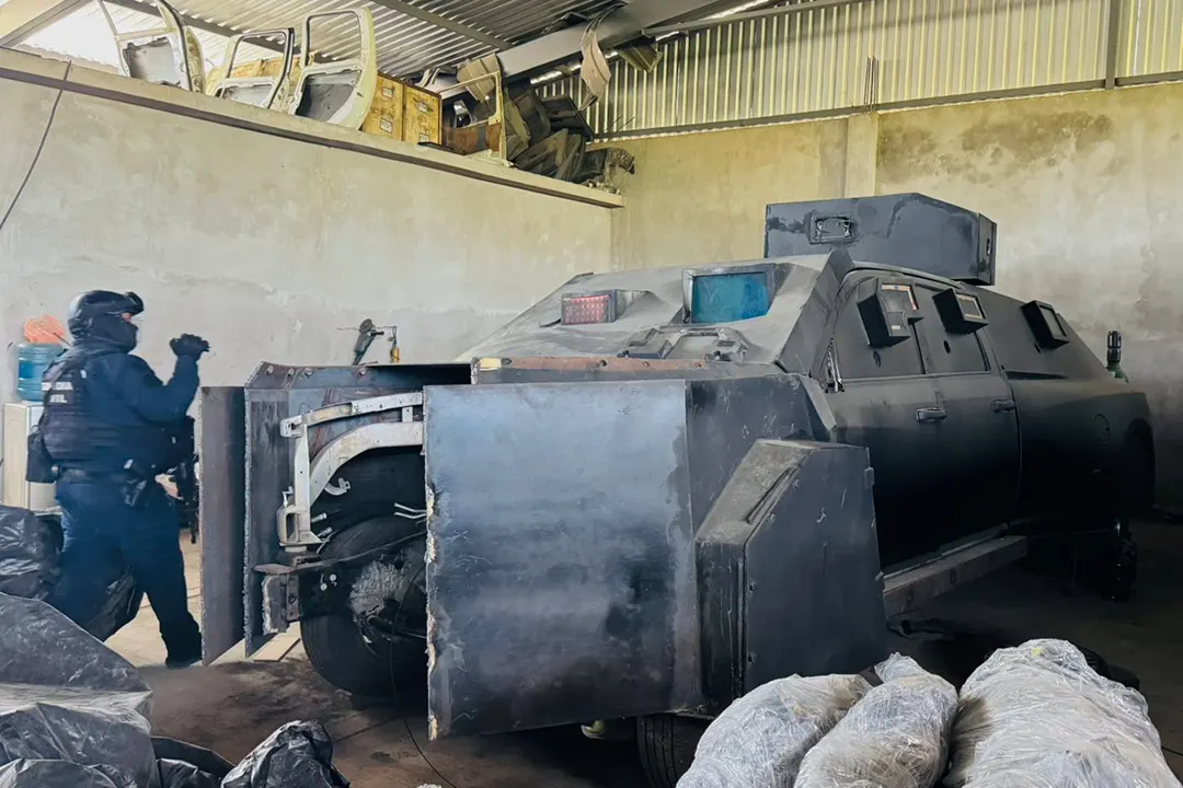En Coahuayana, Michoacán, la SSP aseguró una bodega presuntamente usada para fabricar vehículos blindados, donde fueron localizadas ocho unidades y droga.