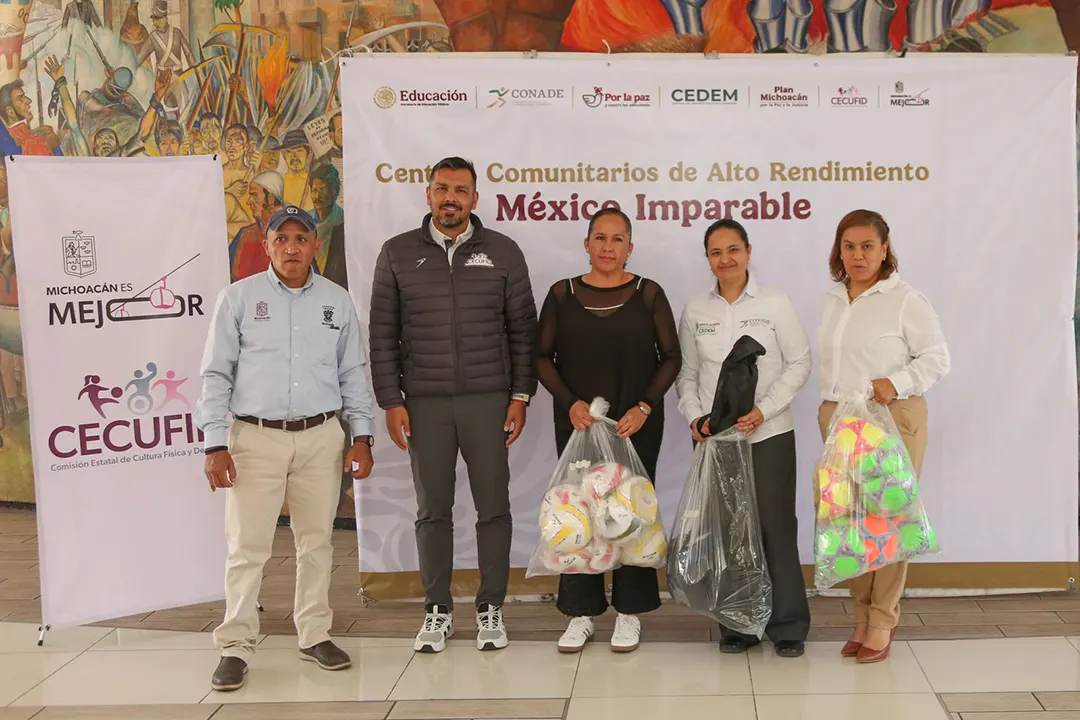 Plan Michoacán y Conade entregaron material deportivo en 10 municipios para impulsar disciplinas como fútbol, voleibol y taekwondo, informó la Cecufid.