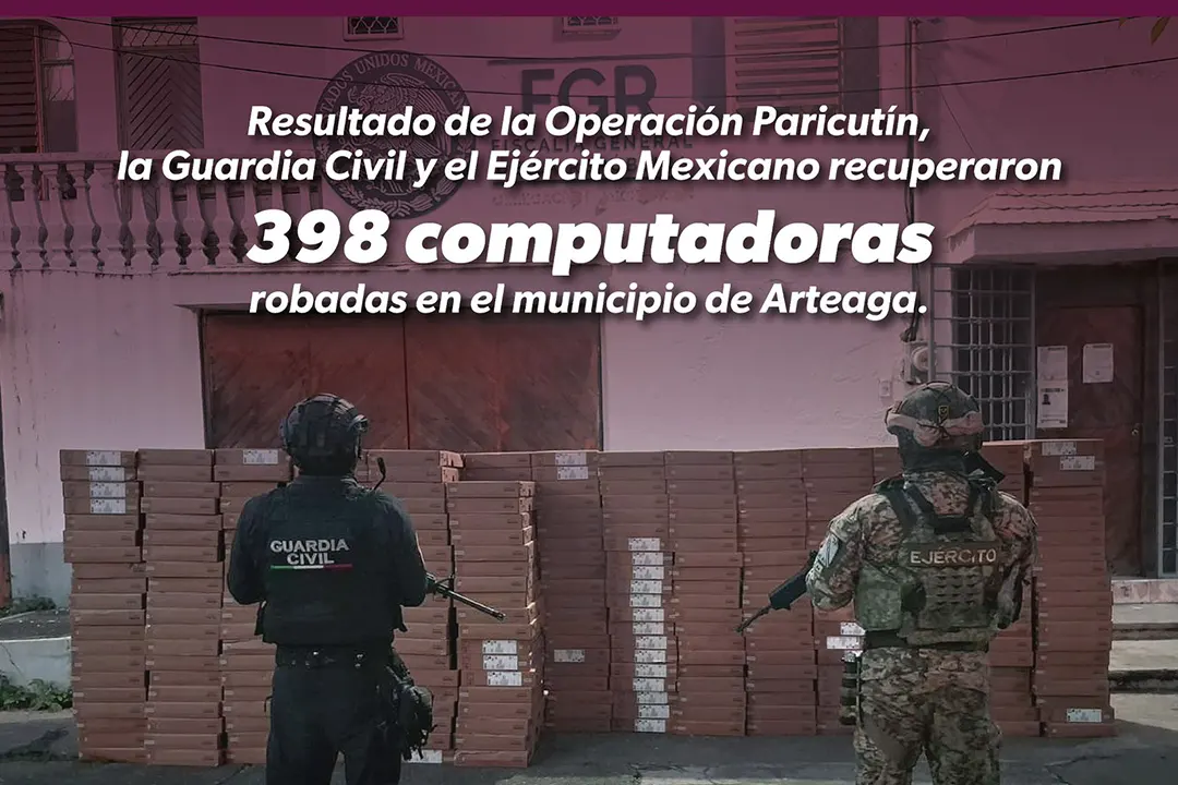 SSP y Ejército recuperan 398 computadoras Lenovo robadas de un tren en Arteaga. El operativo fue parte de la Operación Paricutín en coordinación con fuerzas federales.