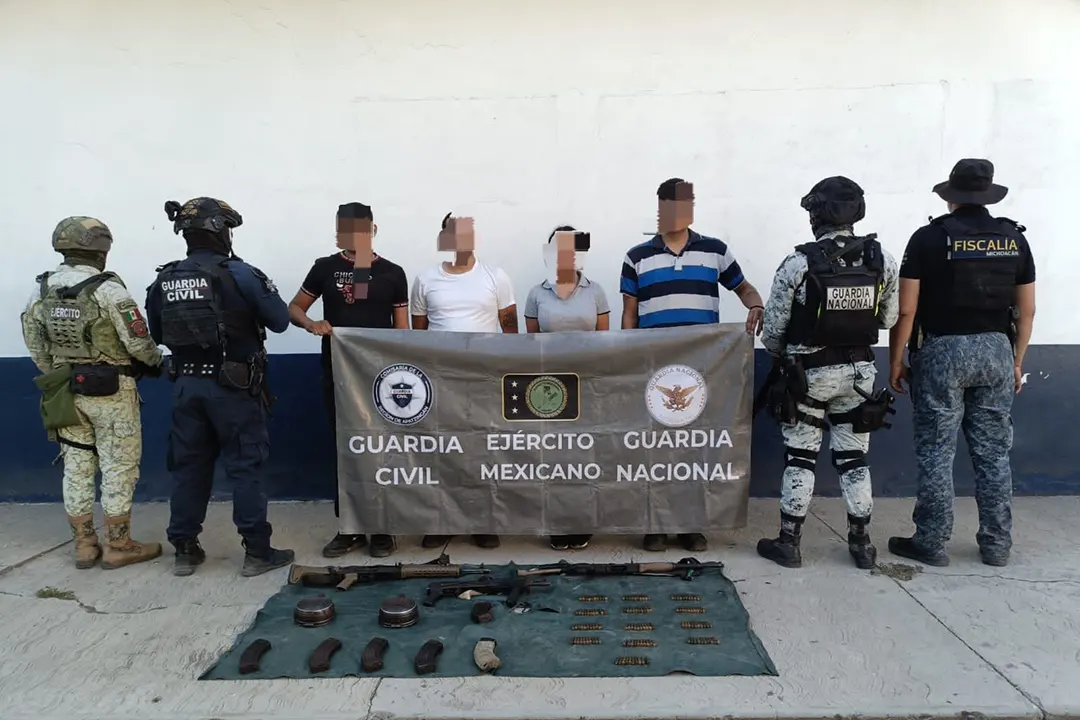 En Gabriel Zamora detienen a cuatro personas, incluyendo un menor, con fusiles, vehículos y municiones. El operativo forma parte del Plan Michoacán por la Paz y la Justicia.