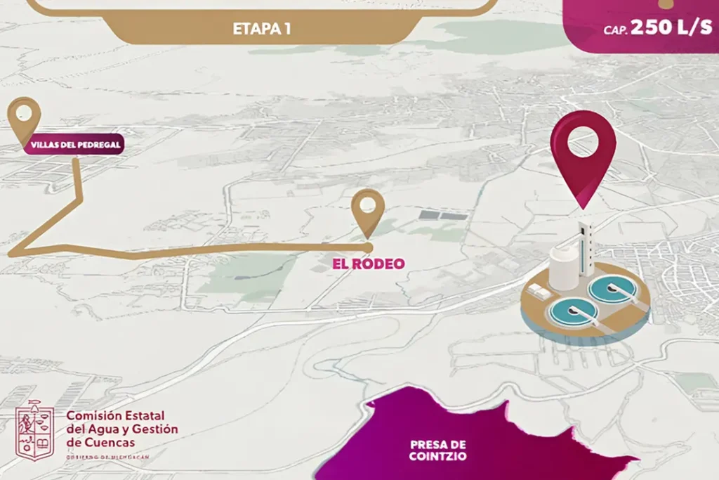 Agregó que el proyecto contempla una línea de conducción desde la presa de Cointzio hacia la planta y de esta a la zona oriente de la ciudad, lo que permitirá apagar 18 pozos de extracción subterránea y contribuir a la recuperación del manto acuífero, con beneficios directos para el organismo operador.