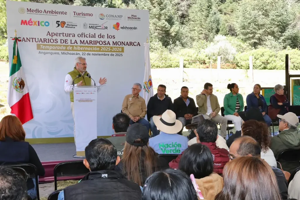 Angangueo, Michoacán, 22 de noviembre de 2025.- Desde el Santuario de Sierra Chincua en el municipio de Angangueo, el gobernador de Michoacán, Alfredo Ramírez Bedolla y las secretarias federales de Medio Ambiente y de Turismo, Alicia Isabel Adriana Bárcena Ibarra y Josefina Rodríguez Zamora, respectivamente, inauguraron de manera oficial la temporada de hibernación 2025-2026 de la Mariposa Monarca.